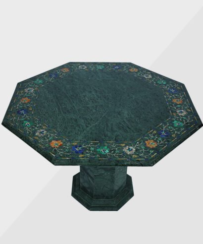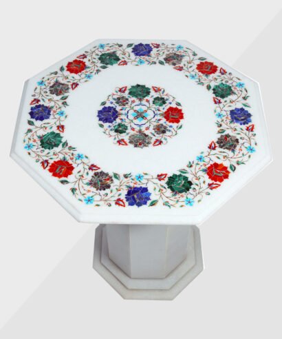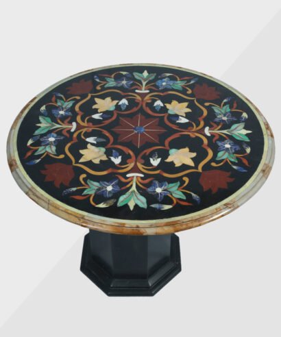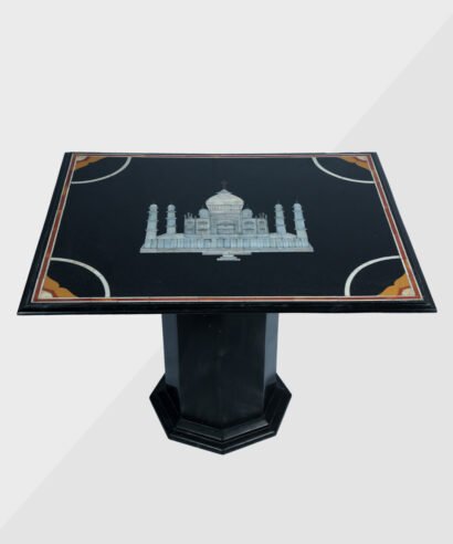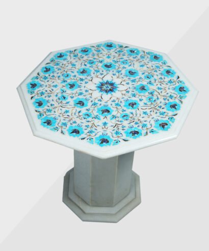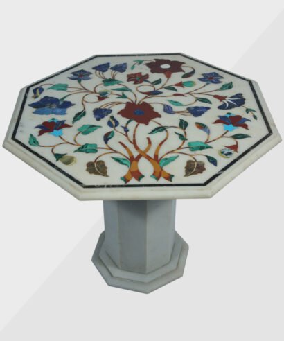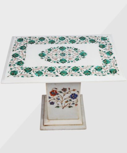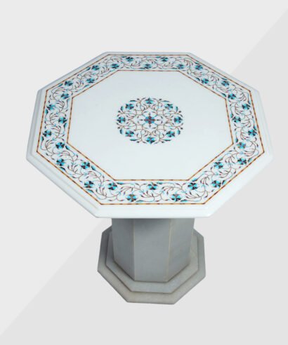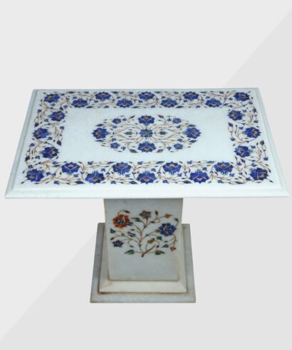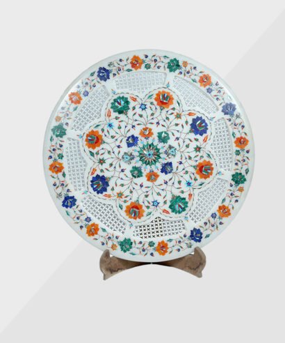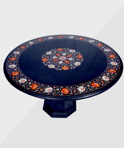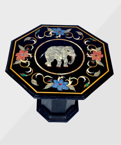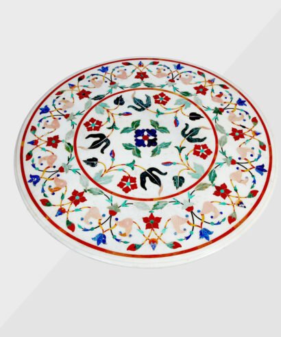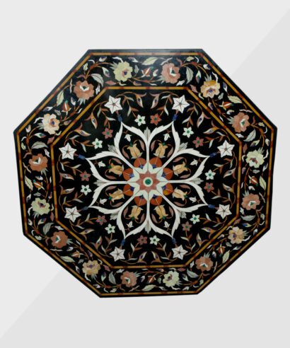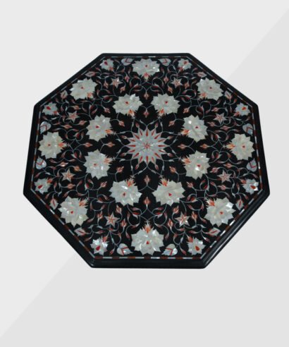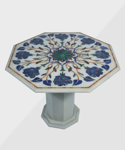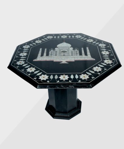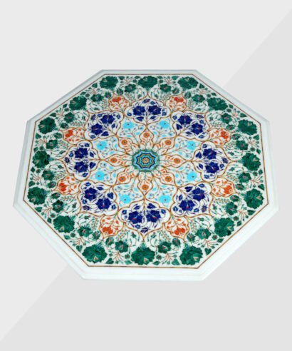 Table Tops made by the artist who are the descendant of those craftsmen who built TajMahal in 17 th century. They make this Table Top with love and care and patiencefully The art used in making marble inlay table is called Inlay work or Parchinkari or Pietre dura and wonderful floral pattern, Italian, geometric decorate designs utilizing semi-valuable stones like lapis lazuli, malachite, turquoise, coral, cornelian, shell, mother of pearl, Jasper and Italian stones inlaid in Indian white marble, black marble, Indian green marble (Baroda green), Indian Black Kadapa Stone etc. there are many kinds of different shapes are made of table tops like Round Table top, Octagonal Table Tops, Rectangle / Dining table tops, Square Table tops, Chess Table tops, Taj Mahal Table tops, Custom Designs Table tops also make plain and inlay marble Table top Base and Stand. These different kind of table tops can be used as dining tables, coffee tables, Center tables, conference tables, chess boards, reading tables, bar tables, Garden table, side and corner tables or any other use as per the indoor and outdoor decorative materials. These tables also looks very beautiful in the lap of nature like can be place in gardens. Marble is stain free it remains undamaged in heavy temperature, you just need wash with simple soap water and remove the dust form it regularly.