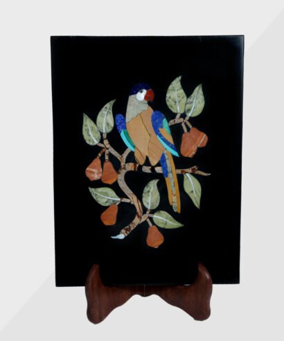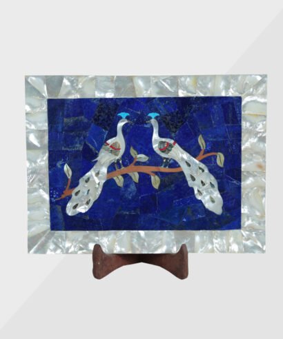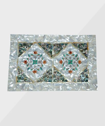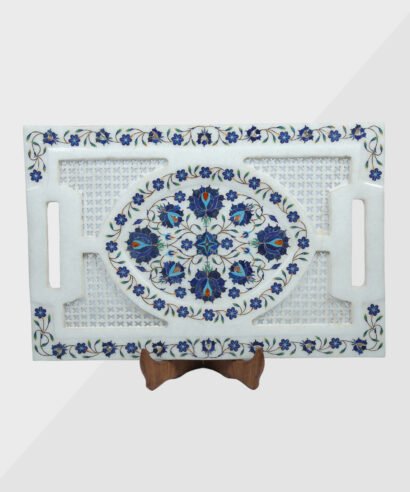 Marble Inlay Serving Tray which is made from Hard Makrana Marble stone and using semi-precious stones in Inlay work comes in attractive multi-colour Stones Inlay Floral Art Can be used in Hotel, Home, and Restaurant & Bar or can be used as Gift, Home Decorative Gift. This travertine is heavy and thick, has beautiful colouring, and makes a fantastic addition to anyone’s home. Great for bars, or serving, also great for vanities or decoration. White marble inlaid tray is one of the best example made by Indian craftsmen. Marble tray can be used for serving anything like tea, coffee, cola or beer to your guests or it can also be used as a decorative piece. If you gift it to someone special, you will get lots of blessings. Also, if you put inlaid marble tray over a bulb and switch off entire light sources, the image of inlaid design reflects on the walls or roof of the room since this marble is translucent in nature.