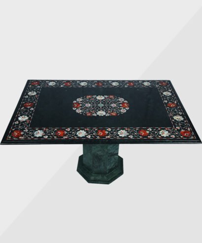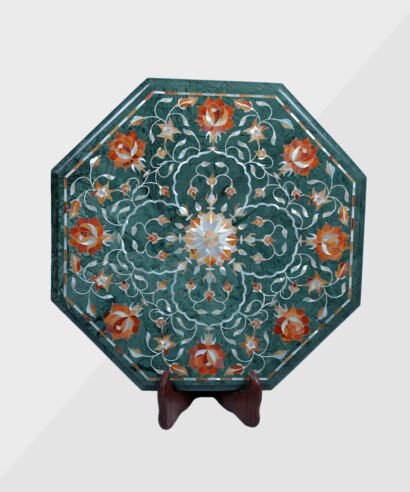 Table Top with love and care and patiencefully The art used in making marble inlay table is called Inlay work or Parchinkari or Pietre dura and wonderful floral pattern, Italian, geometric decorate designs utilizing semi-valuable stones like lapis lazuli, malachite, turquoise, coral, cornelian, shell, mother of pearl, Jasper and Italian stones inlaid in Indian white marble, black marble, Indian green marble (Baroda green), Indian Black Kadapa Stone etc. there are many kinds of different shapes are made of table tops like Round Table top, Octagonal Table Tops, Rectangle / Dining table tops, Square Table tops, Chess Table tops, Taj Mahal Table tops, Custom Designs Table tops also make plain and inlay marble Table top Base and Stand. These different kind of table tops can be used as dining tables, coffee tables, Center tables, conference tables, chess boards, reading tables, bar tables, Garden table, side and corner tables or any other use as per the indoor and outdoor decorative materials. These tables also looks very beautiful in the lap of nature like can be place in gardens. Marble is stain free it remains undamaged in heavy temperature, you just need wash with simple soap water and remove the dust form it regularly.