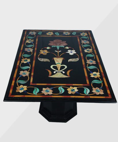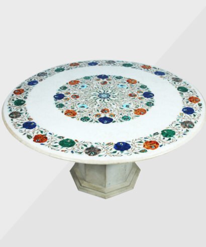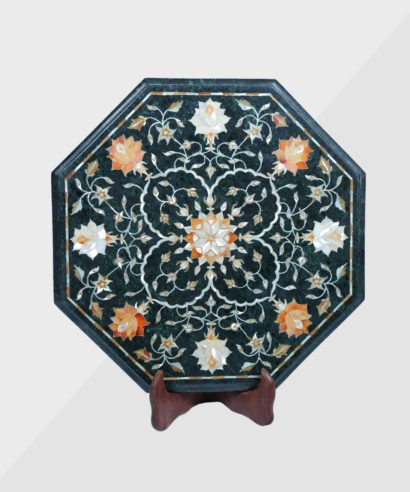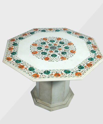 Table Top with love and care and patiencefully The art used in making marble inlay table is called Inlay work or Parchinkari or Pietre dura and wonderful floral pattern, Italian, geometric decorate designs utilizing semi-valuable stones like lapis lazuli, malachite, turquoise, coral, cornelian, shell, mother of pearl, Jasper and Italian stones inlaid in Indian white marble, black marble, Indian green marble (Baroda green), Indian Black Kadapa Stone etc. there are many kinds of different shapes are made of table tops like Round Table top, Octagonal Table Tops, Rectangle / Dining table tops, Square Table tops, Chess Table tops, Taj Mahal Table tops, Custom Designs Table tops also make plain and inlay marble Table top Base and Stand. These different kind of table tops can be used as dining tables, coffee tables, Center tables, conference tables, chess boards, reading tables, bar tables, Garden table, side and corner tables or any other use as per the indoor and outdoor decorative materials. These tables also looks very beautiful in the lap of nature like can be place in gardens. Marble is stain free it remains undamaged in heavy temperature, you just need wash with simple soap water and remove the dust form it regularly.