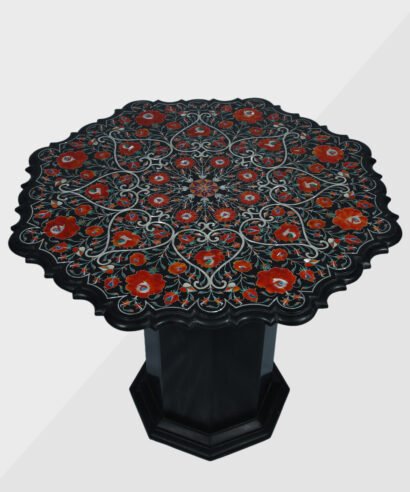 Table Top with love and care and patiencefully The art used in making marble inlay table is called Inlay work or Parchinkari or Pietre dura and wonderful floral pattern, Italian, geometric decorate designs utilizing semi-valuable stones like lapis lazuli, malachite, turquoise, coral, cornelian, shell, mother of pearl, Jasper and Italian stones inlaid in Indian white marble, black marble, Indian green marble (Baroda green), Indian Black Kadapa Stone etc. there are many kinds of different shapes are made of table tops like Round Table top, Octagonal Table Tops, Rectangle / Dining table tops, Square Table tops, Chess Table tops, Taj Mahal Table tops, Custom Designs Table tops also make plain and inlay marble Table top Base and Stand. These different kind of table tops can be used as dining tables, coffee tables, Center tables, conference tables, chess boards, reading tables, bar tables, Garden table, side and corner tables or any other use as per the indoor and outdoor decorative materials. These tables also looks very beautiful in the lap of nature like can be place in gardens. Marble is stain free it remains undamaged in heavy temperature, you just need wash with simple soap water and remove the dust form it regularly.